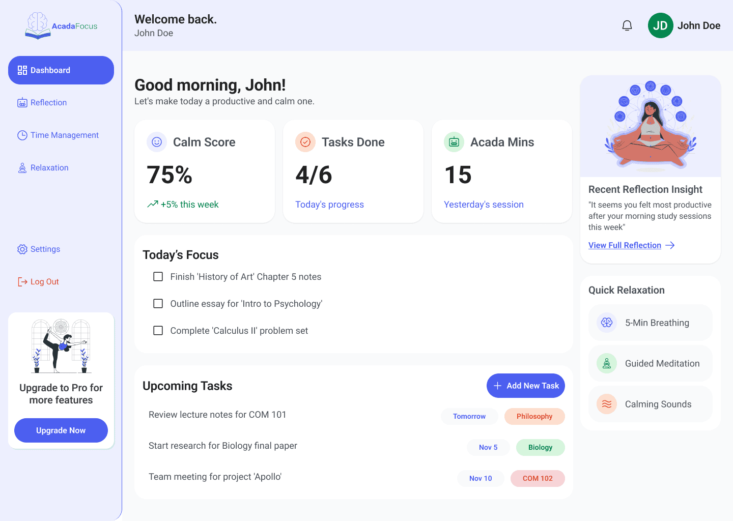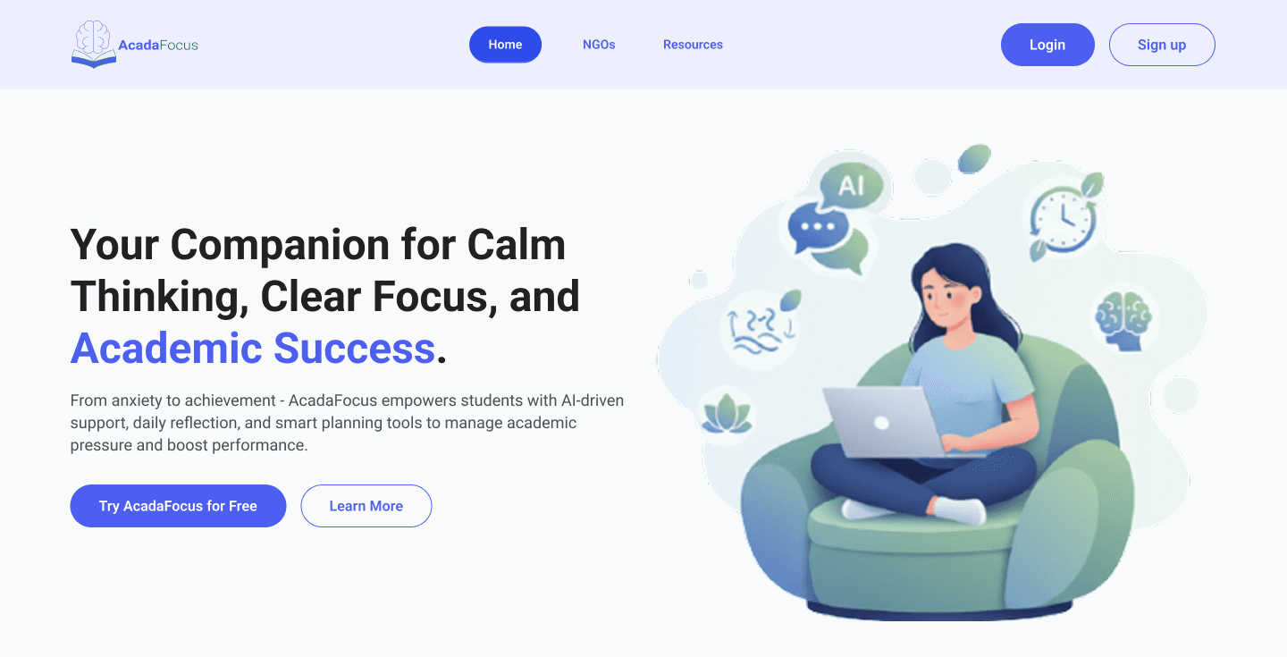 It is addressing the growing mental health crises among students. Unlike generic wellness apps, AcadaFocus specifically targets the intersection of academic deliverables and stress management, providing a structured environment for students to gain control.