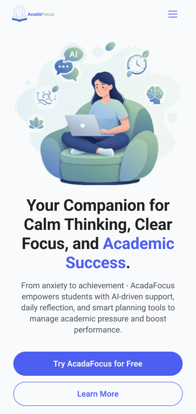 The landing page introduces AcadaFocus as a calm entry point for students under academic pressure. It focuses on clarity over persuasion, using minimal copy and soothing visuals to communicate support without urgency. Purpose selection replaces forced sign up, allowing students to engage before committing.
